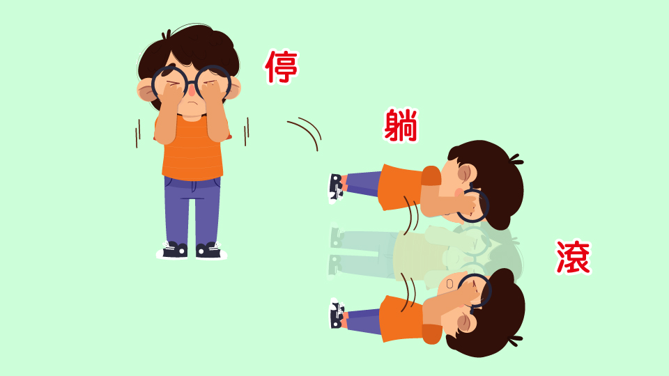 (1) 馬上【停】在原地,奔跑會助長火勢,讓火越來越大。立刻將雙手摀在臉上,用手保護臉部,將傷害降到最低。